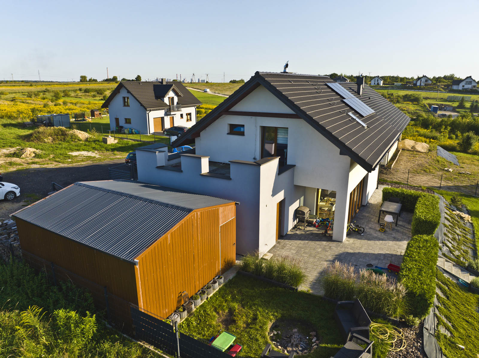 Stolarka: okna PCV (ciepły montaż) Oknoplast, brama segmentowa Hormann, drzwi wejściowe Delta