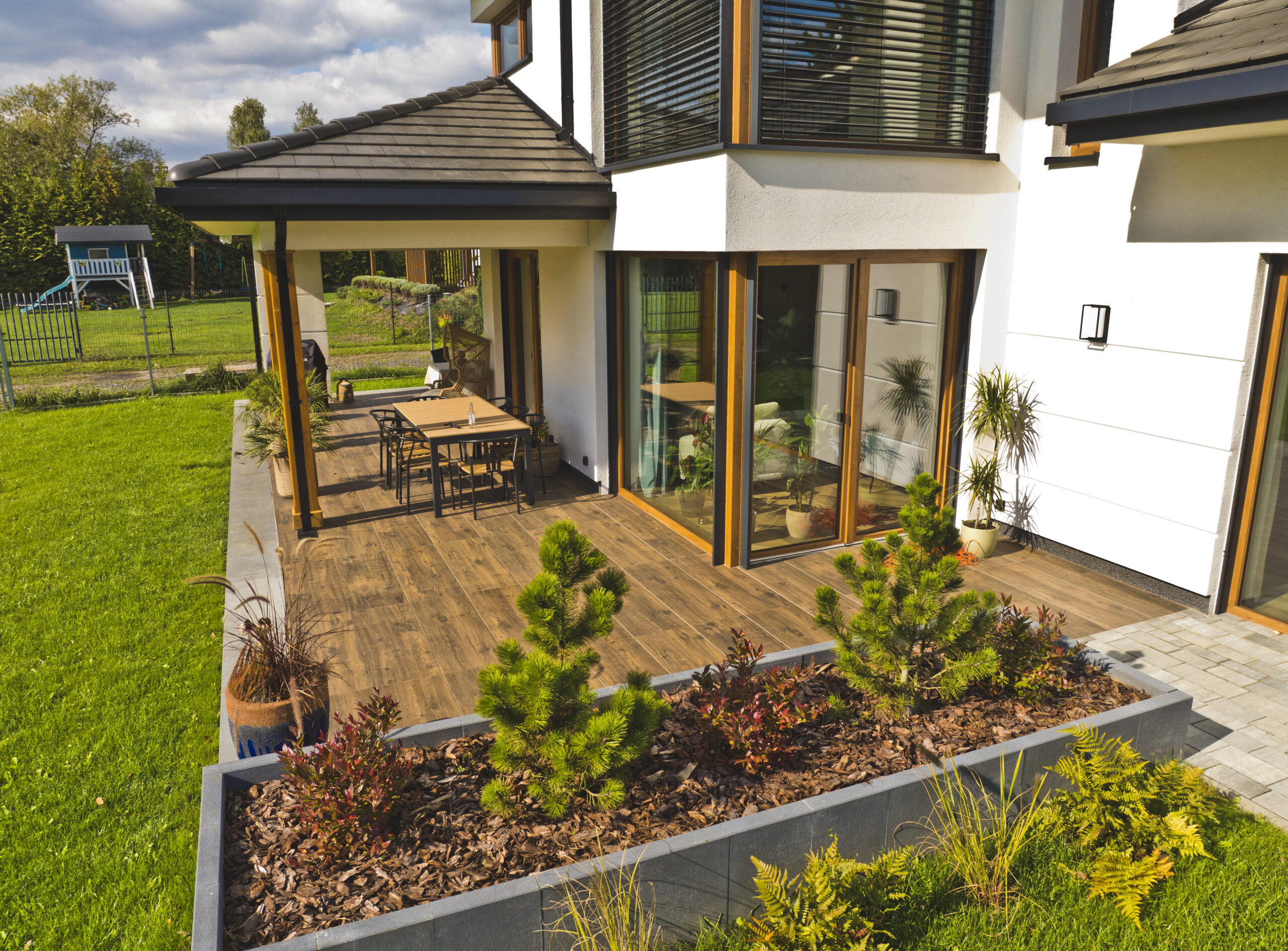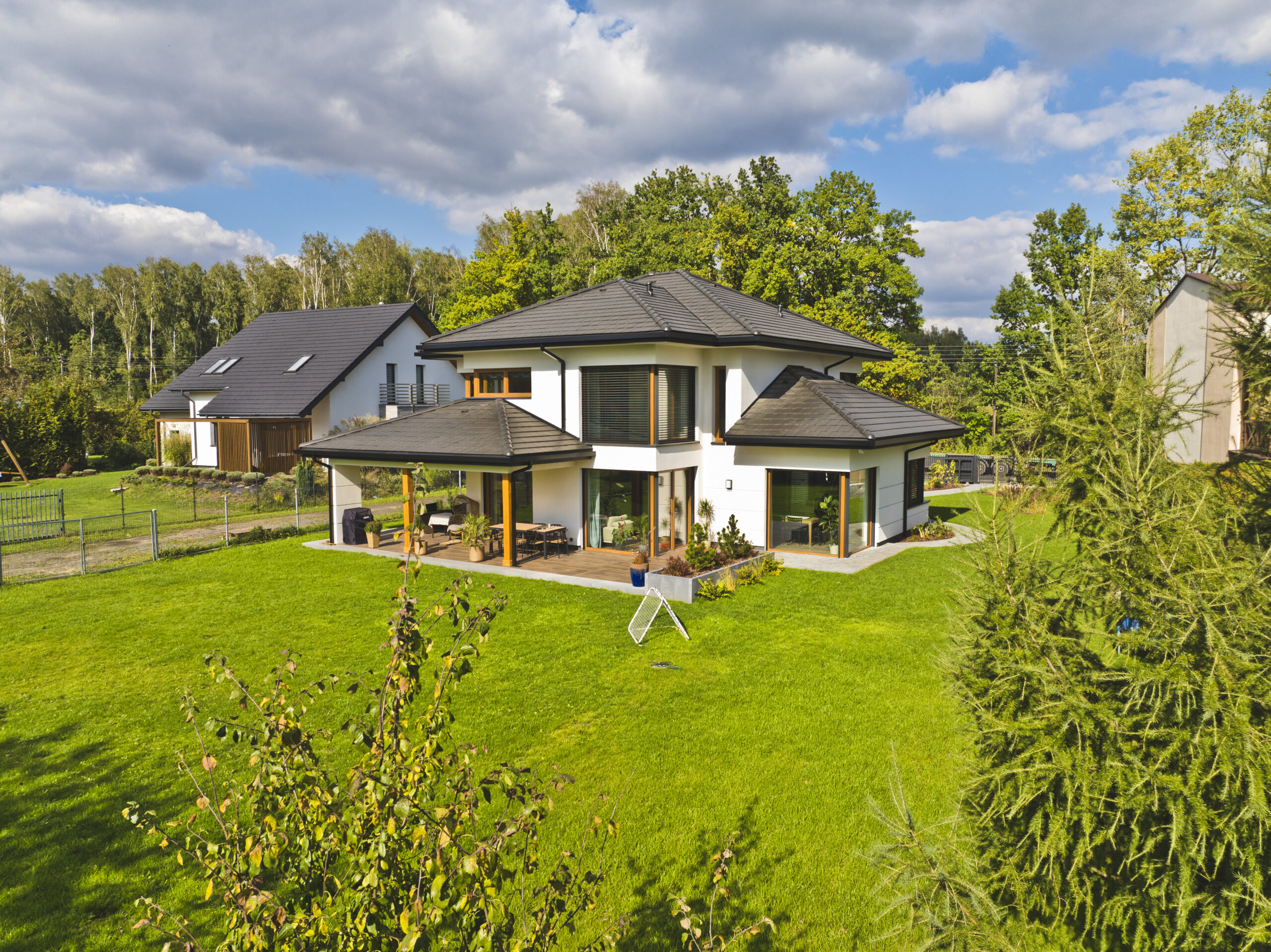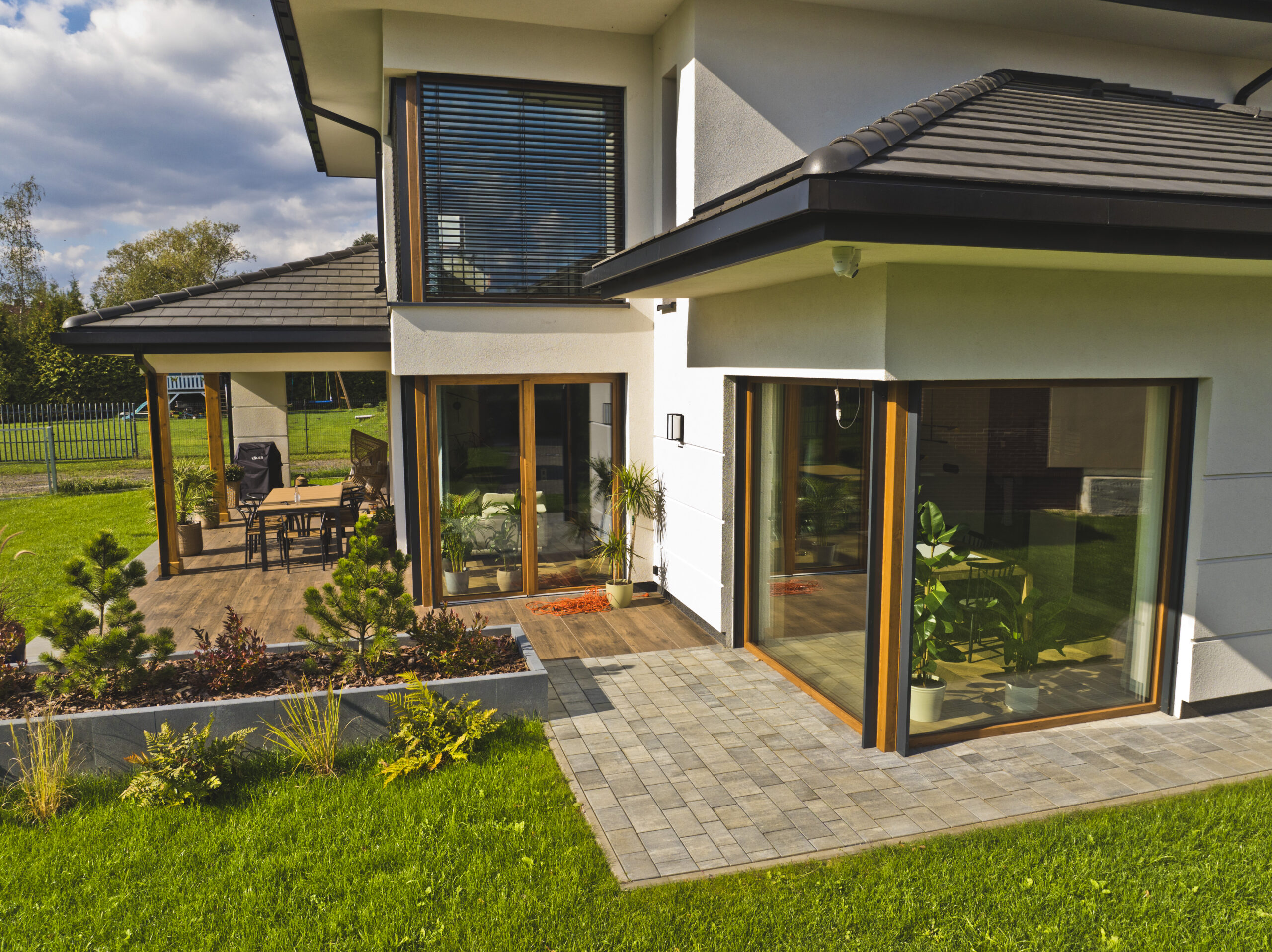 • Stolarka: okna PCV profil VEKA, drzwi wejściowe Delta Special, brama Hormann, żaluzje fasadowe