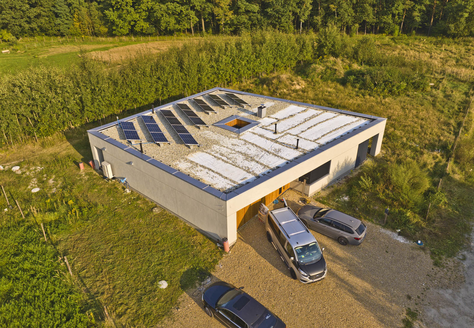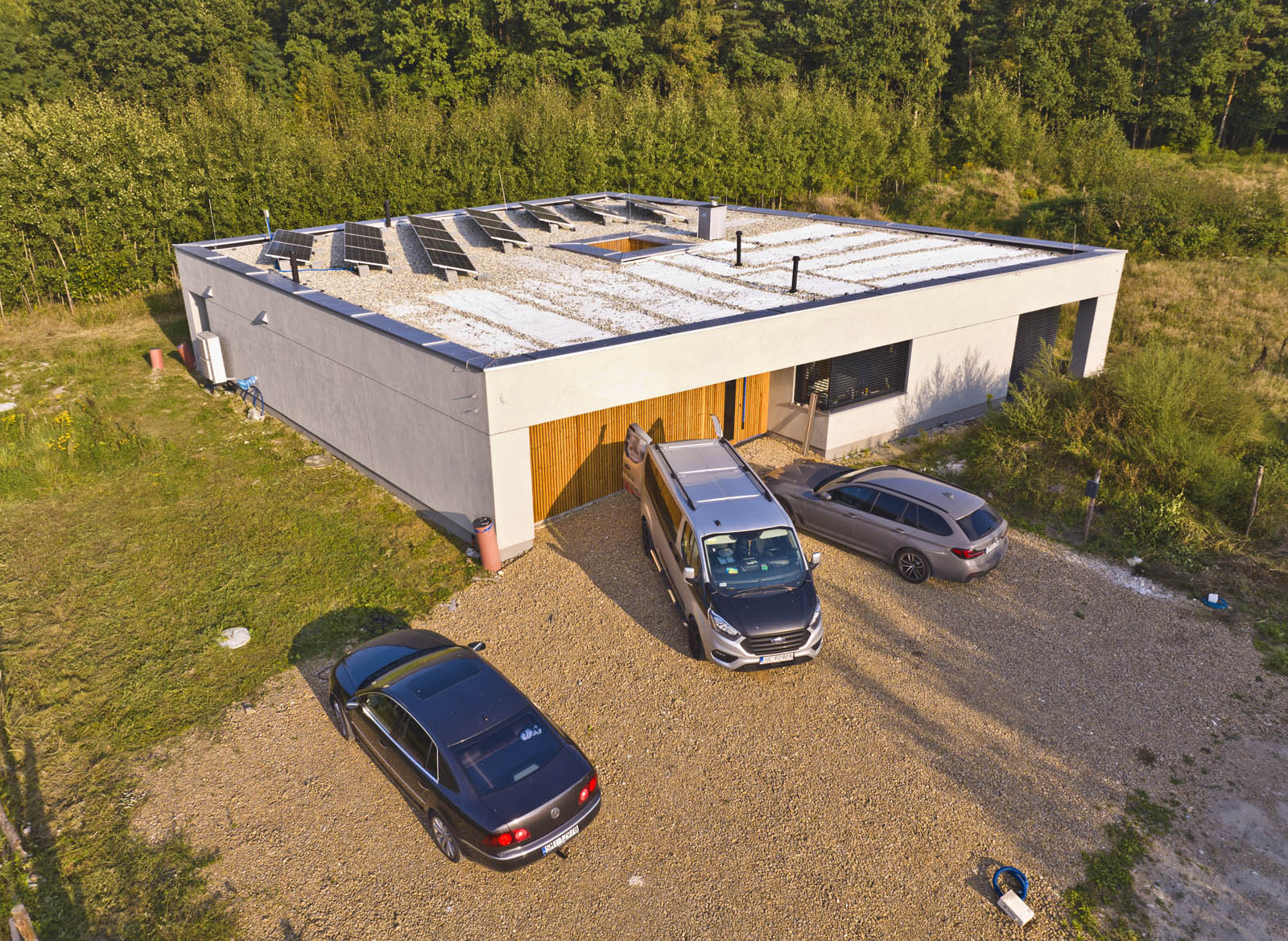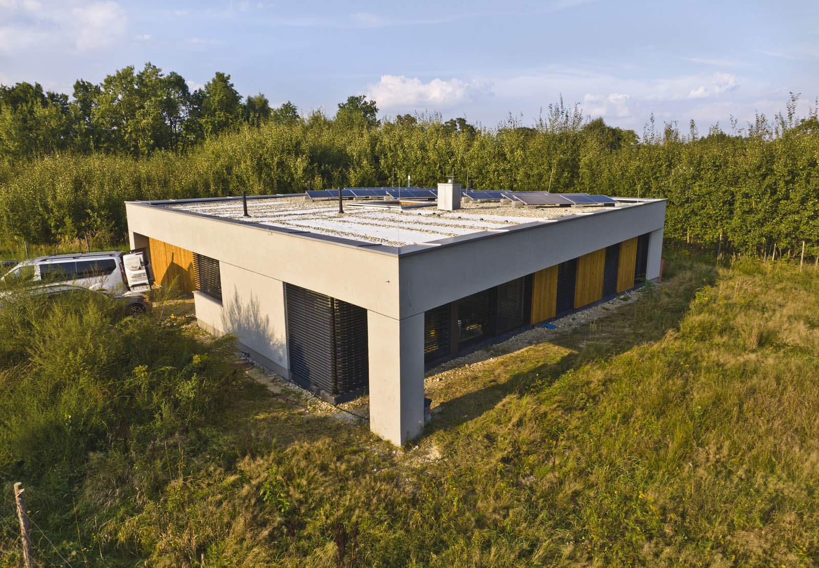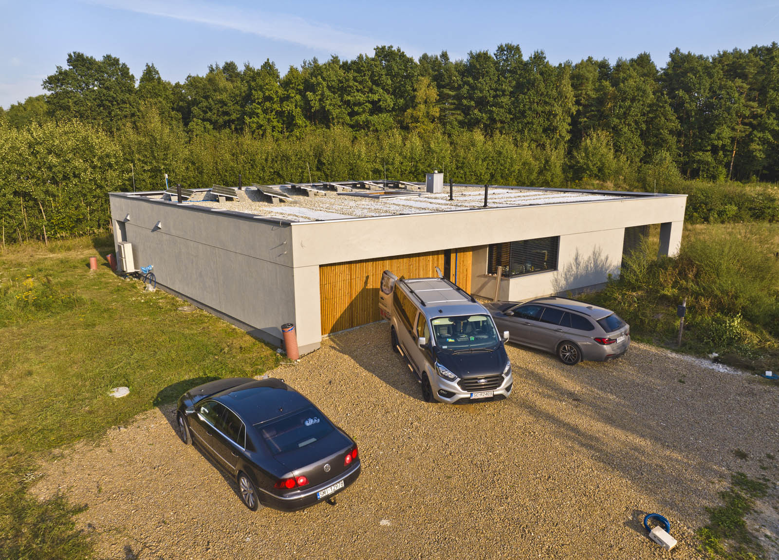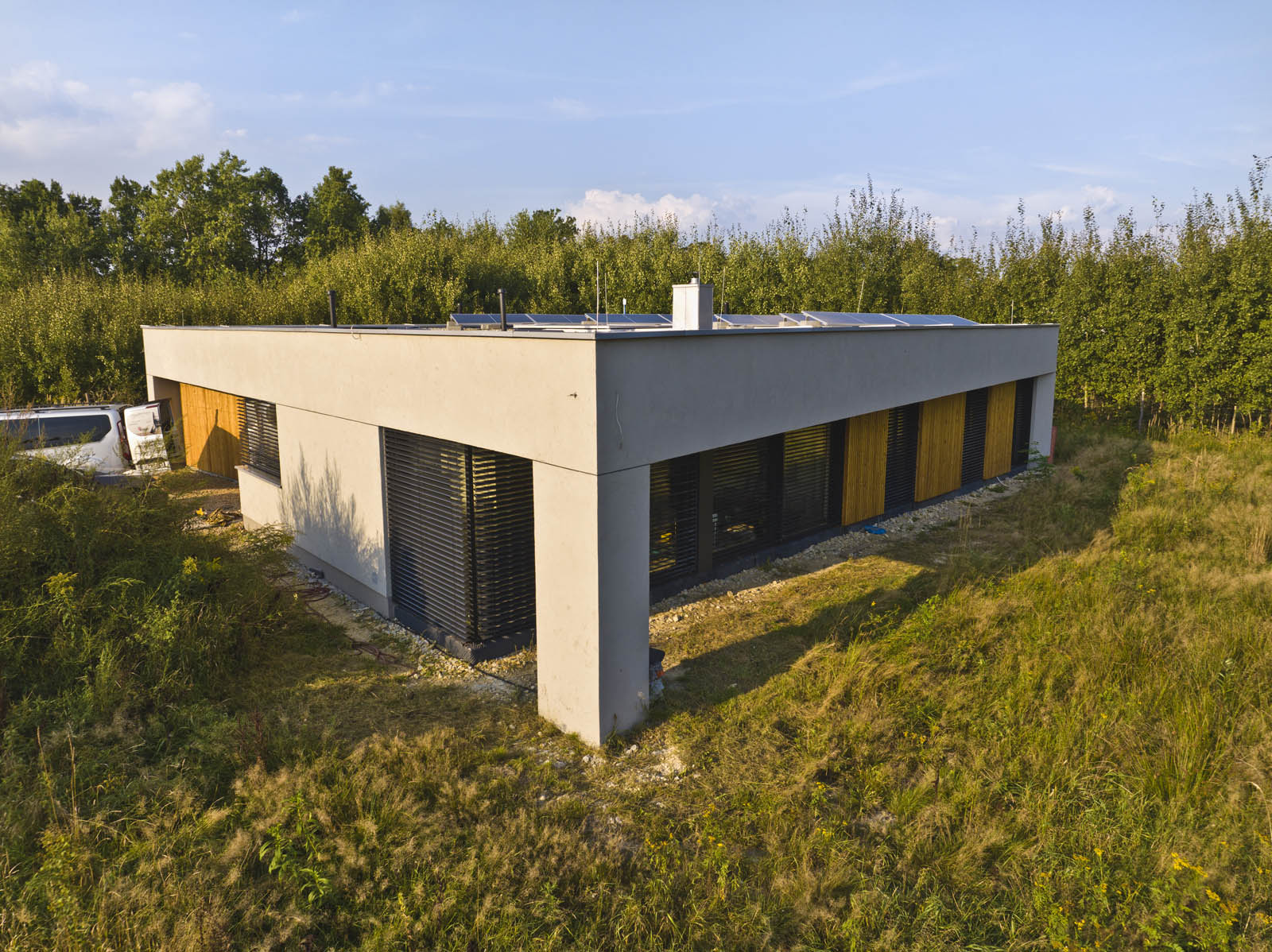 Stolarka: okna aluminiowe (ciepły montaż) z oknami przesuwnymi HST Oknoplus, okno narożne glass corner, żaluzje fasadowe, brama fasadowa Hormann, drzwi wejściowe Parmax